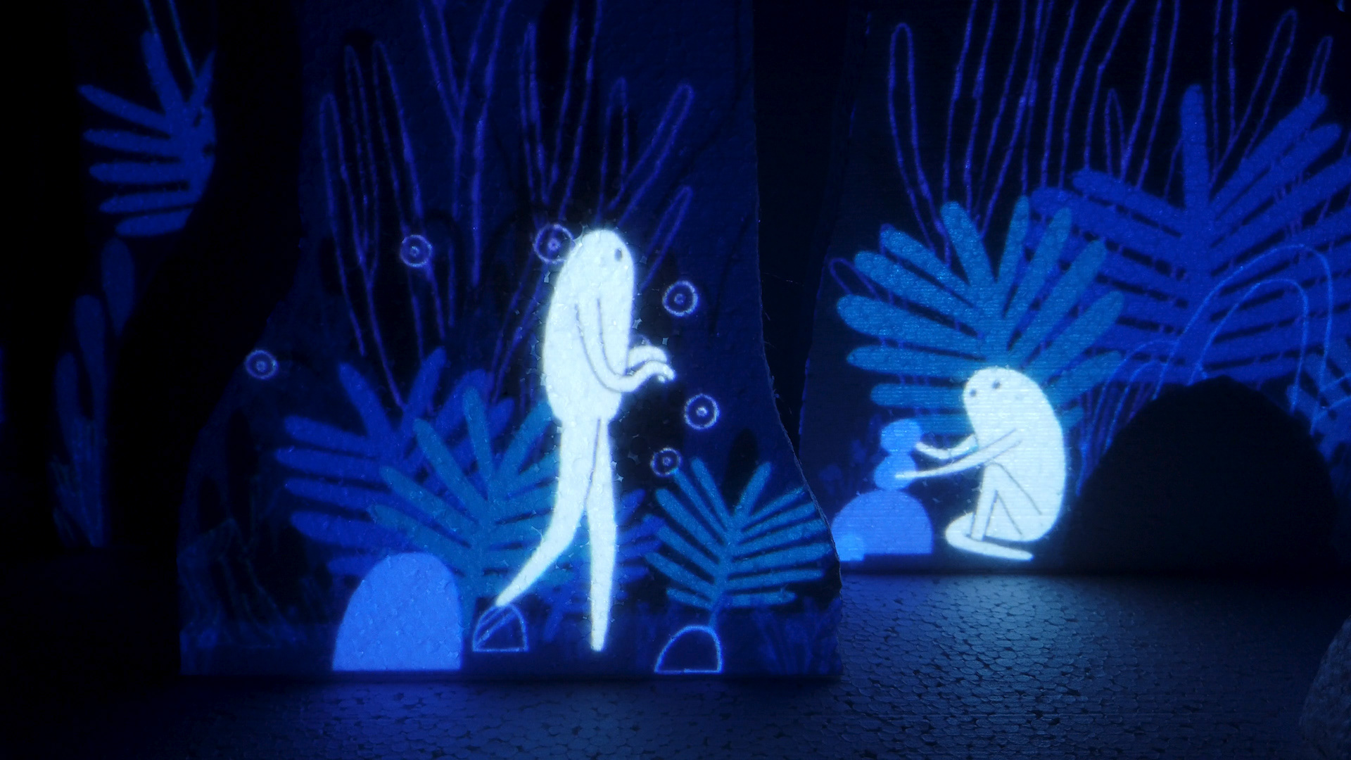 Bei Einbruch der Nacht erwachen die neugierigen Waldgeister und beginnen ihr zielloses herumirren. Figuren und Hintergründe wurden im Rahmen einer Installation auf eine Styroporlandschaft projiziert.